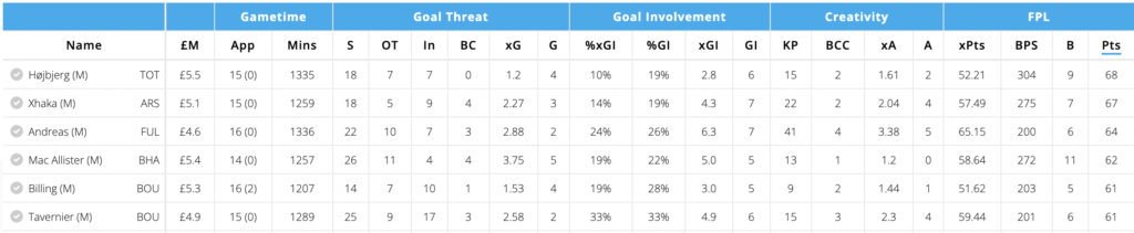 As we can see from the above graphic, among players priced £5.5 only 4 midfielders/ attackers have a better points tally. He will be looking to add to his tally against Palace this weekend.
