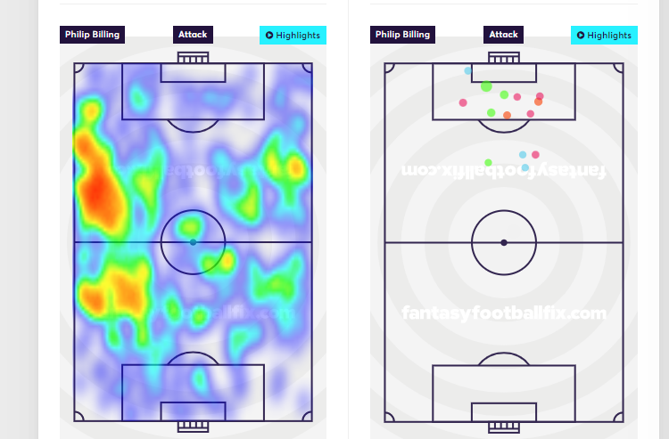 The East London club concede 55% of their chances down the center. Only four teams boast a worse tally than that. As we can see from Billing’s shot map, that is largely where his shots come from.