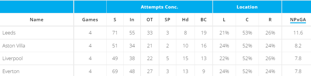 As we can see from the above image, Aston Villa have the second worst for NPxGA and Big chances conceded since Unai Emery took charge. This was more clearly evident in their most recent encounter, with Liverpool. Indeed, no team had a worse xGC than Villa (3.57). The Villains conceded a whopping 7 big chances against Jurgen Klopp’s men.