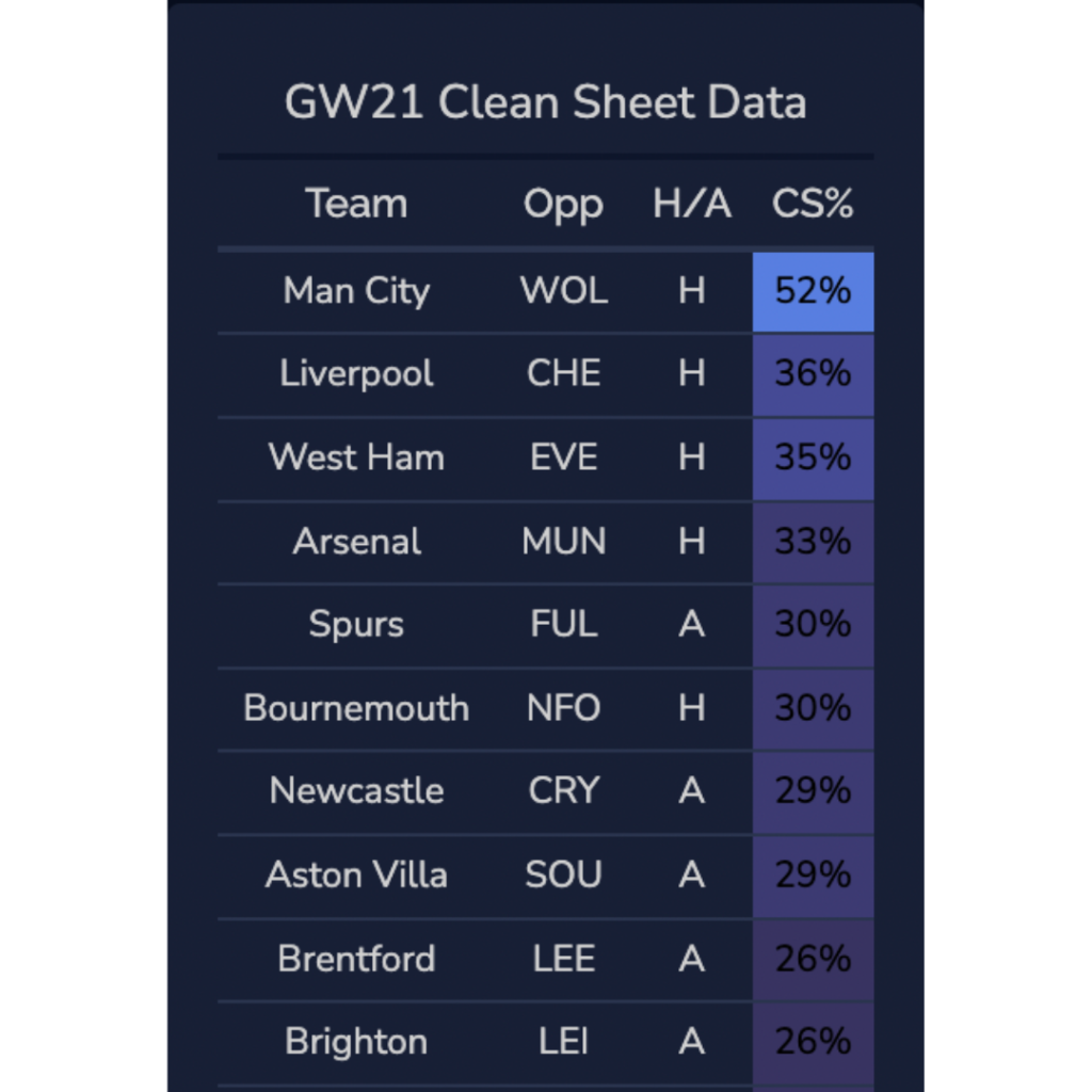 These two talisman have been incredibly consistent this season and it’s no wonder the data back them to perform once again. Haaland has a monstrous 79% chance to score and also tops the Predicted Points table with 8.8 expected points. As for Kane, he’s close behind with 47% on the Anytime Scorer table and 8.6 expected points in GW21. Both of them face rather easy opponents this week, making them great shouts for Captaincy.