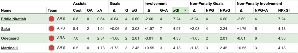In terms of goal threat, it is mainly dominated by Saka and Nketiah. Saka tops both of them and has a higher xG on average. However, Nketiah is not too far behind and is in fact higher in terms of non-penalty xG. Moreover, Nketiah has more goal chances from inside the box and a higher number of big chances as well.