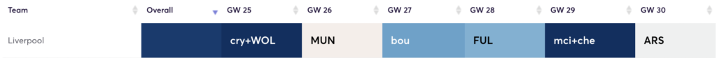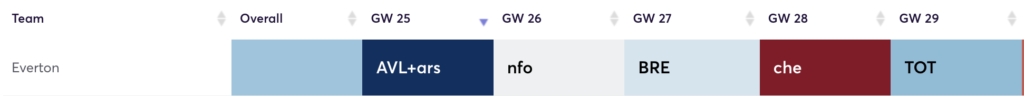 They have a double against Leicester and Everton in GW25. Both of these fixtures are favourable for them to gain points. They both are in the bottom half of the table and also in the bottom half for expected goals conceded over the past 5 weeks. Even after this, they face Bournemouth, Fulham, Palace, and Leeds.