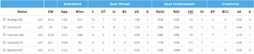 Leeds attack is a decent option to punt as they double and we have Gnonto in our team, he’s one of the nailed Leeds attackers and has decent numbers, 2nd highest xGI amongst Leeds players. He’s also got good assist potential along with a good goal threat, with Rodrigo rumored to be injured, Gnonto is the safest option to consider from Leeds.