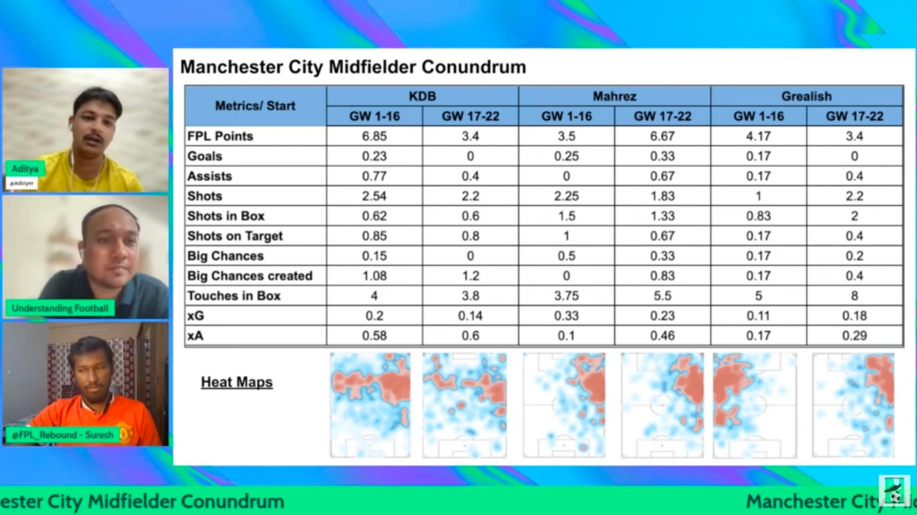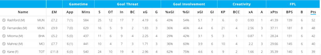 Mahrez is the most in form Man City Midfielder at the moment with 3 goals, 4 assists, 46 points from 7 games since the World Cup break. Surprisngly he is still a good differential option at just 11% ownership right now.ย He makes the cut ahead of KDB and Grealish as seen by better underlying numbers and output since the World Cup in the below image.