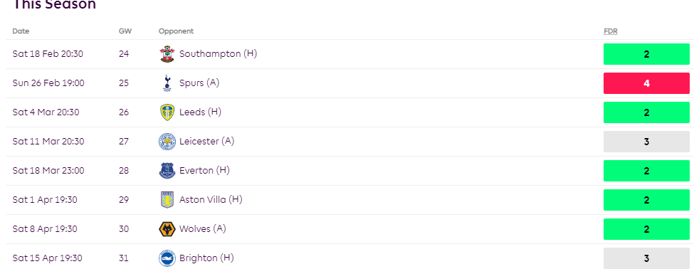 The Foxes are another team that play in GW25. Although the rest of their fixtures are a bit of a mixed bag, Maddison’s presence makes them a threat against any opposition. Only five teams have scored more goals than the Foxes so far in this campaign.