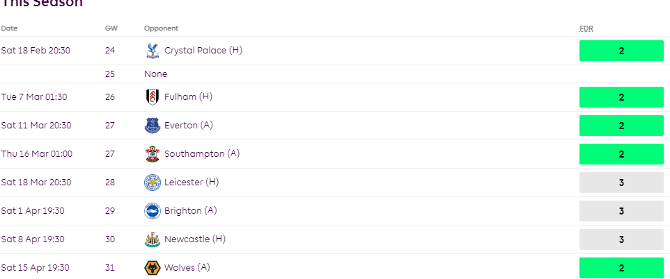 Chelsea are one of few teams who have a guaranteed fixture in both GWs 25 and 29. Besides, they have an amazing run of games coming up with 6 of their next 8 games coming against teams in the bottom half of the table. Five of the matchups have an FDR rating of 2.