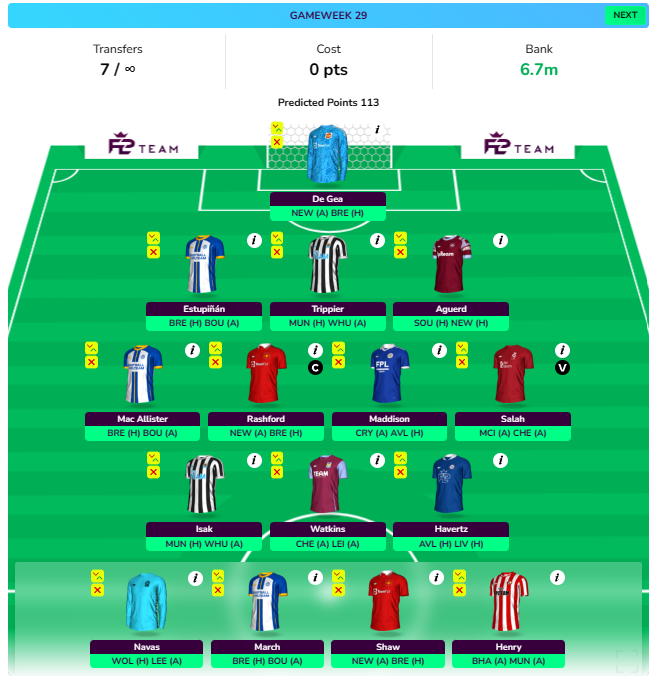 - Good Differential players Double Gameweek players available- Salah, Fernandes, Brighton Mids, Maddison, Watkins, Havertz, Isak, etc