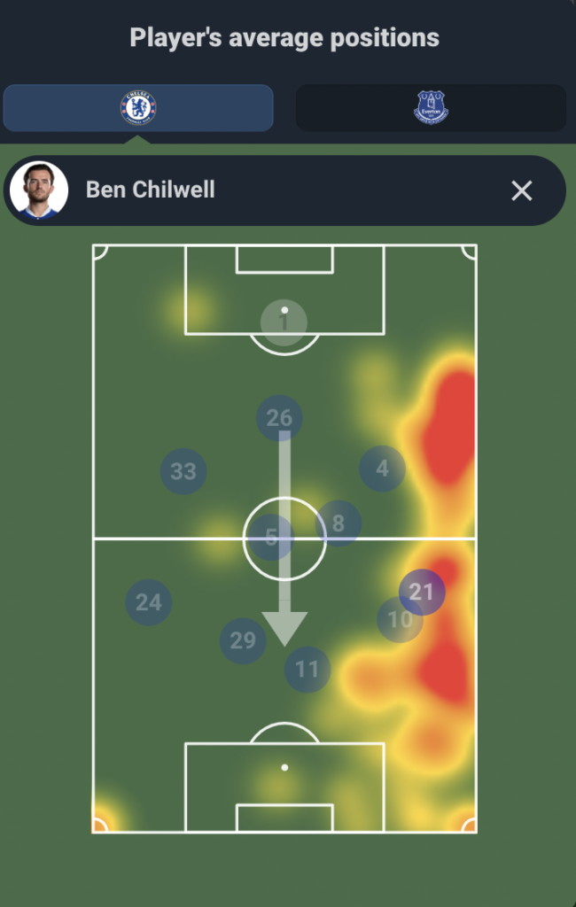 Chilwell(21) average position and heatmap vs Leicester via Sofascore