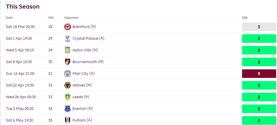 - He has a good fixture in GW28(vs Everton(H)) and doubles in GW29. Note: He could blank in GW32 vs Man United if Man United beat Fulham this weekend.