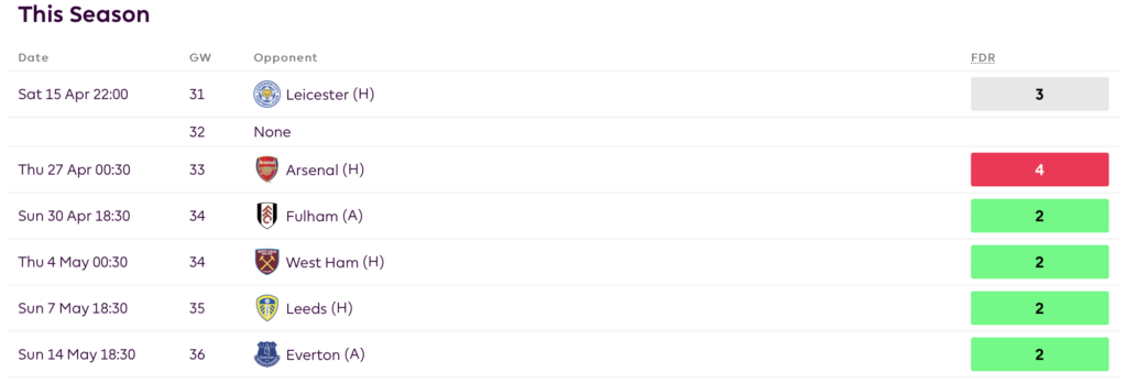 As stated earlier, we got to pick players from teams that have something to play for. Newcastle are among the top of that list. As we look at the fixtures, 4 of their 6 games have an FDR rating of 2. Now is the best time to bring in their assets into your teams.