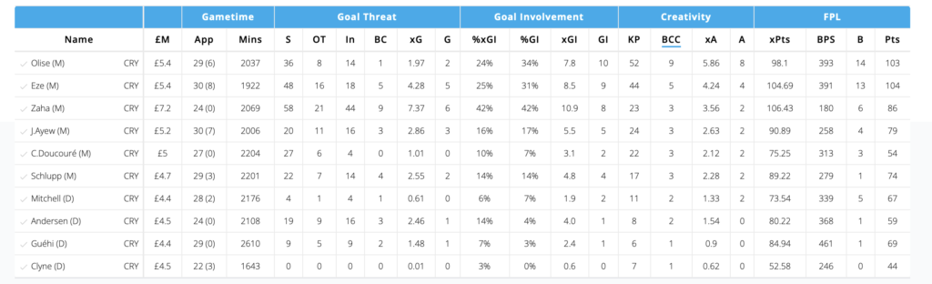 If we look at the numbers for Crystal Palace players, Olise clearly comes out on top for creativity. He has created far more big chances than any of his compatriots. He has made far more key passes than anyone else. As a result, unlike a certain Wilfred Zaha, Olise will get bonus points even if he gets one assist.