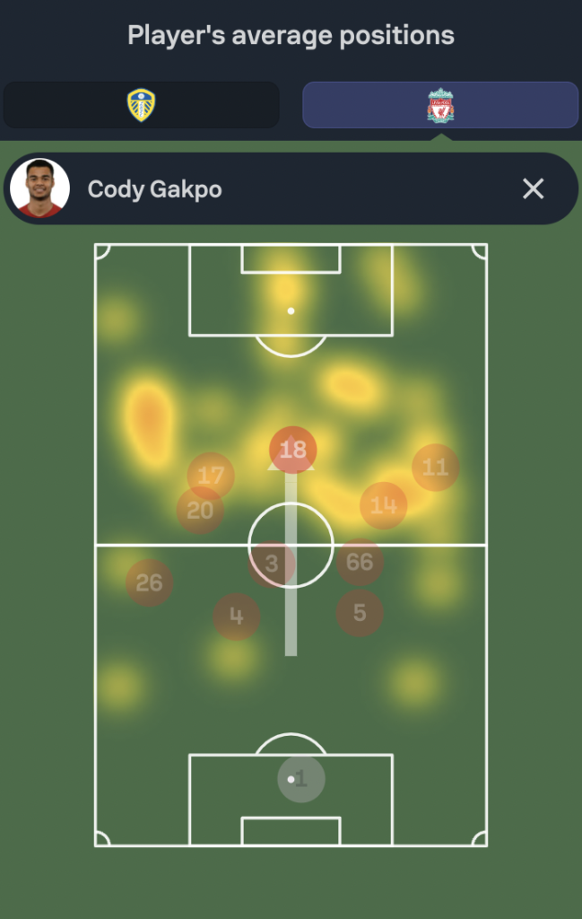 Gakpo operates as a striker and plays higher up the pitch which can be seen from his heatmap and average position map in GW31 vs Leeds below(Jersey 18), but he is listed as a midfielder in the game which means one more point for each goal scored and an extra point whenever Liverpool keep a clean sheet.