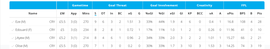 Eze tops all the metrics for “Goal Threat” while Olise tops it for “Creator”. Eze has the Most shots(9), Most Big chances(2), and Best xG(1.5) among Palace players and has 3 goals to show for. With Zaha ruled out for GW32 as well due to injury, Palace should continue to operate the same way.