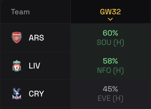 This week features only two teams in the haul potential category and that is because they far exceed the odds of other teams. Liverpool play Forest and they have a 58% chance of scoring more than two goals past them, with Arsenal given a 55% chance to do the same against Southampton this weekend.