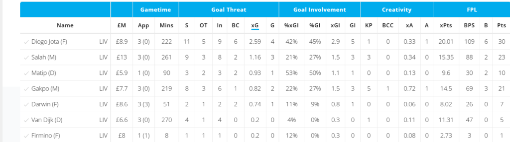 Jota comfortably tops all the attacking metrics even ahead of Salah- Top for xG, Big Chances, Shots inside the box, etc. 6 Big Chances, 2.59 xG over 3 games are excellent underlying numbers. Not just among the Liverpool team, his underlying numbers are one of the best in the league which makes him a great option to punt on at just 5.5% ownership.