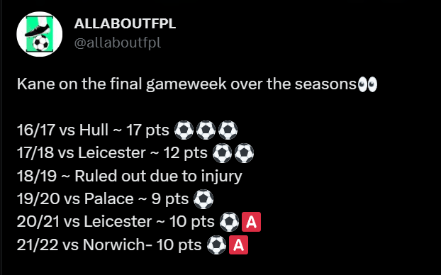 Kane also has a particular liking to the final Gameweek of the season. He has 8 goals, 2 assists, 10 bonus, 58 points from his last five GW38 appearances over the years averaging 11.6 points/game.