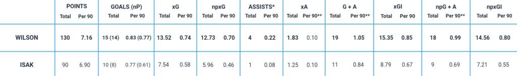 - Wilson has played 1634 minutes across 18 starts, with Isak playing 1174 minutes over 13 starts