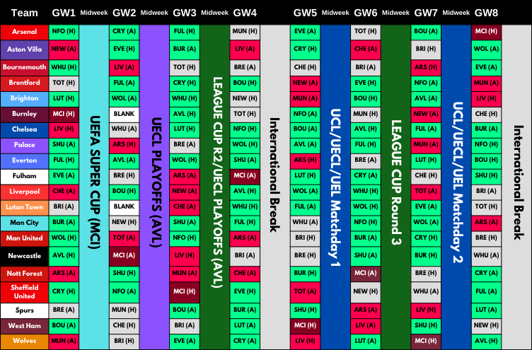 - Midweek between GW3 and GW4: UECL qualifiers(Leg 2) for Aston Villa and Carabao Cup for teams not playing in Europe(12 teams)