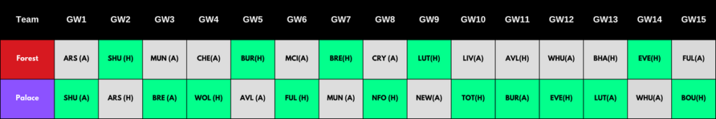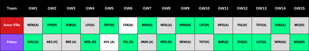 Villa and Palace rotate really well till GW15 having just 3/15 games against Last season’s Top 12 teams. Watch out for the most nailed 4.5 million defender during pre-season as mentioned above.