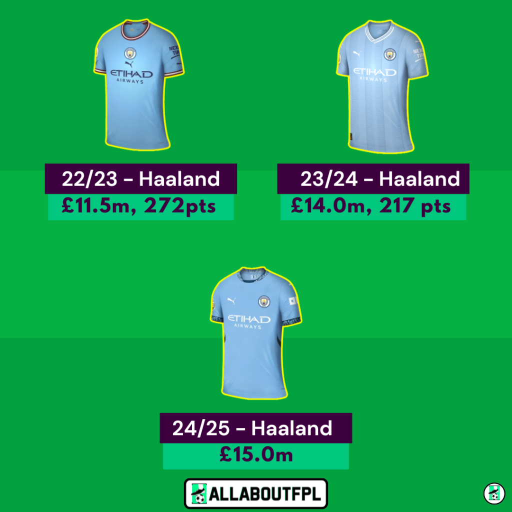 Haaland was priced at £14.0 million for the 2023/24 season after his 272 points (36 goals, 9 assists) in his debut season(2022/23). He did justify his price tag getting 27 goals, 8 assists and 217 FPL Points from just 31 appearances in the 2023/24 season.