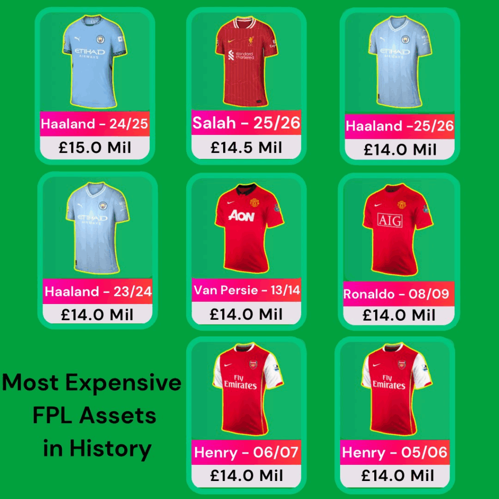 Haaland reached a peak price of 14.5 Million during the 23/24 season, and Thiery Henry in the 05/06 season reached a peak price of 14.9 Million.