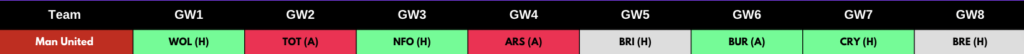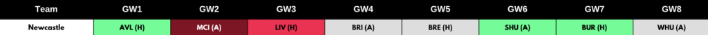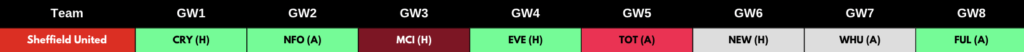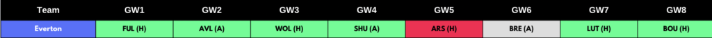Everton have a very nice run of fixtures to start the season. 5 out of 8 of their first games are to be played at Goodison Park. They also face 2 recently promoted sides during this period Sheffield United (GW4) and Luton (GW7). Furthermore, they will also face just one of the league’s “big six” in their opening 8 matches.