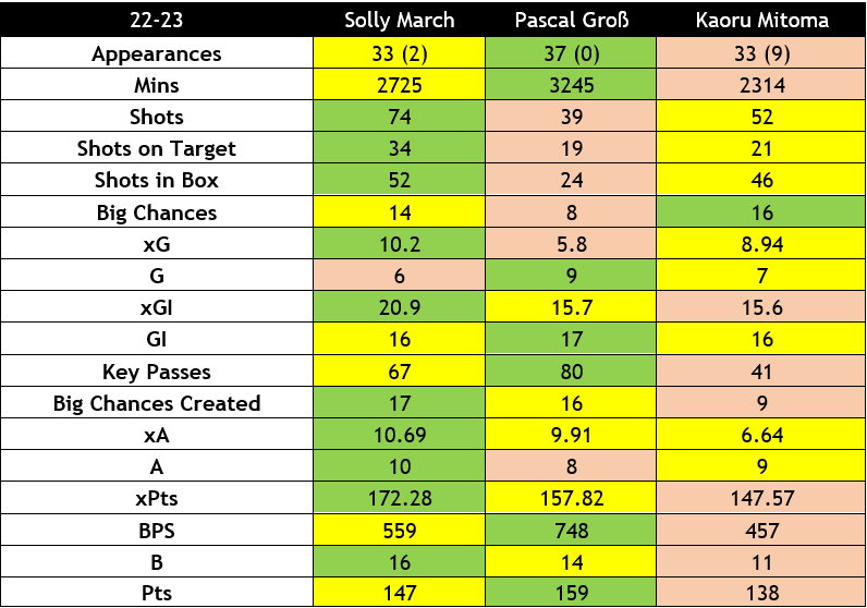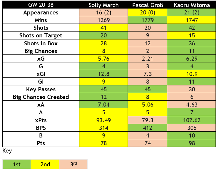 But let’s be fair to Mitoma. He broke into the first team quite late. So let’s relook at the same numbers for the period when BHA trumped the likes of Man City for xG ie GWs 20-38