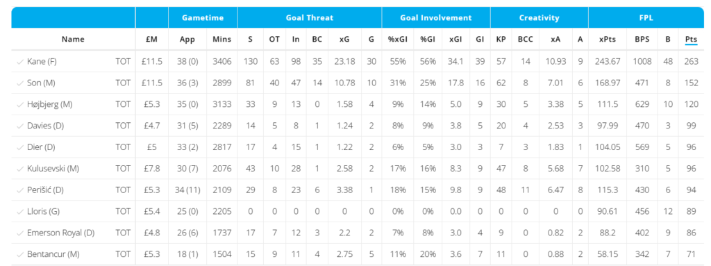 Tottenham Players FPL points, Minutes Played, and Stats from last season