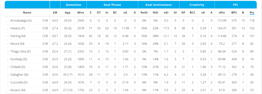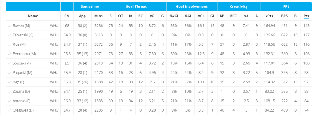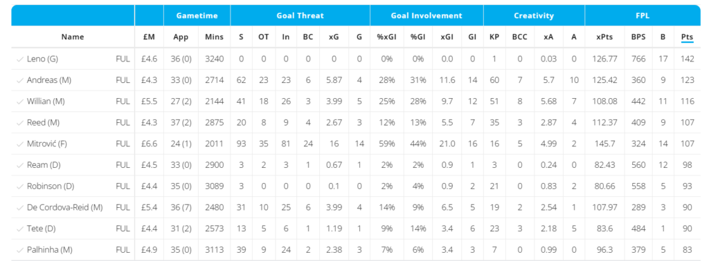 Arsenal Players FPL points, Minutes Played, and Stats from last season