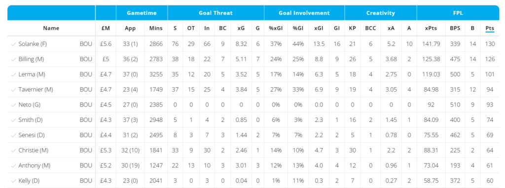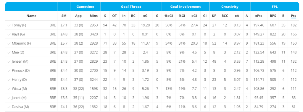 Brighton Players FPL points, Minutes Played and Stats from last season