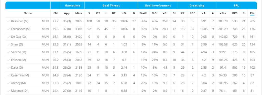 Manchester United Players FPL points, Minutes Played and Stats from last season