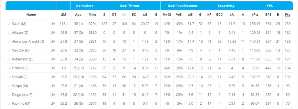 Liverpool Players FPL points, Minutes Played and Stats from last season