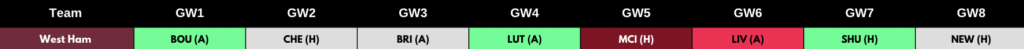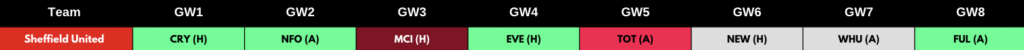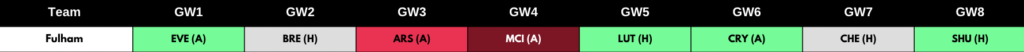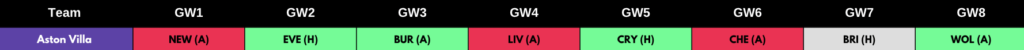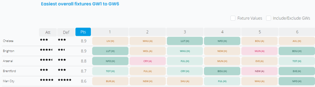 Brighton also has a more than favourable set of opening fixtures. They play Luton (H), Wolves (A), West Ham (H) and Bournemouth (H) in 4 of their first 6 matches. This is shown in the table below using the Fantasy Football Hub fixture ticker (GW 1-6) which has been sorted in order of the easiest overall fixtures between GW1 – GW6.