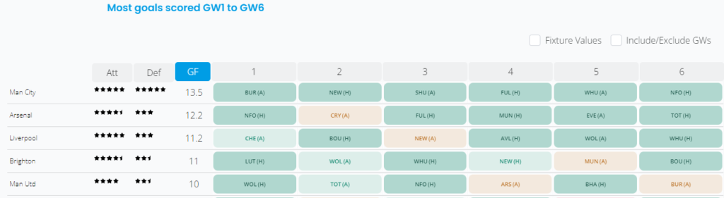 Again, using the Fantasy Football Hub fixture ticker (GW 1-6), we can see that Arsenal is predicted to score the second most goals in the league between GW1-GW6. This is based on attacking threats and fixtures. In my opinion, Nketiah is one to watch. If he starts GW1, then he could be a great route into Arsenal’s attack for managers at just 5.5m.