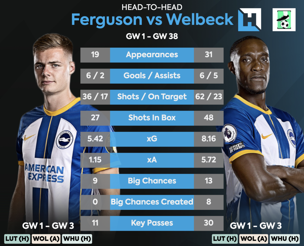 It’s widely expected that Feguson will feature more regualrly for Brighton this season. But he faced competion from Welbeck last season and it doesn’t look like Welback is number 2 yet which means the cmopetiton for Welback and Ferguson for the one striker spot will continue atleast in the beginning of the season.
