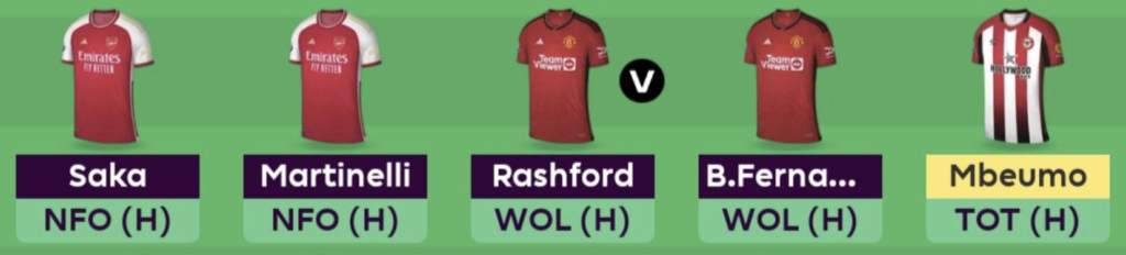 The midfield is stack with Arsenal and United players- Saka, Martinelli, Rashford and Bruno Fernandes.