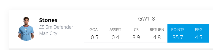 Stones has to be on the most nailed defenders from the Manchester City team- Capable of playing at Center back, Inverted RB and also right back. He has improved so much in the last year that he is one of the first names on the team sheet. He has been playing in an inverted position in midfield which puts high higher up on the pitch when City are attacking. Among Defenders priced at 5.5 or Below, Stones is Top for Expected Points(35.7) from GW1- GW8 as per FFHub’s Points Prediction Tool.