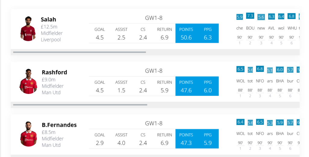 Only Salah(50.6) is expected to score more FPL points than the Manchester United duo among midfielders from GW1- GW8 as per Fantasy Football Hub’s Predicted Points tool.