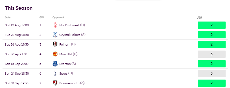 Estupinan is currently at a whopping 51.5% ownership and rigthly so- Only Haaland(86.5%) and Saka(56.1%) has higher ownership. He is such a Budget Bargain at 5.0 million with 7 assists last season. Only TAA(11), Trippier(9), Robertson(8) had more assists among defenders than him last season but are priced at 8.0 and 6.5 respectively which is much higher than the 5.0 for Estupinan. Not just in GW1 against a newly promoted Luton team, The first 3 fixtures screams for FPL points- Luton(H), Wolves(A), West Ham(H).