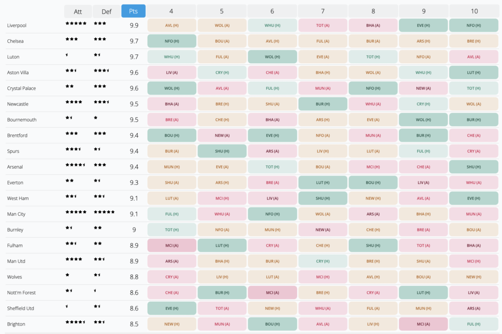 FPL Fixture List from GW4-10