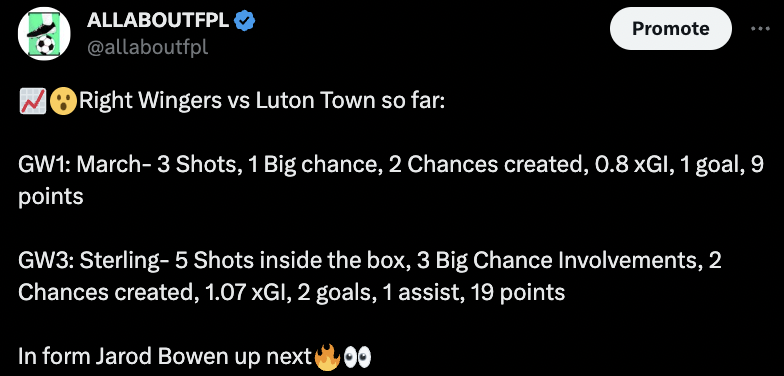 - Bowen has registered an xGI of 2.2 in the season so far and has 2 goals and an assist already this season. He also had a whopping three big chances in GW3 vs Brighton and will be up against Luton Town.