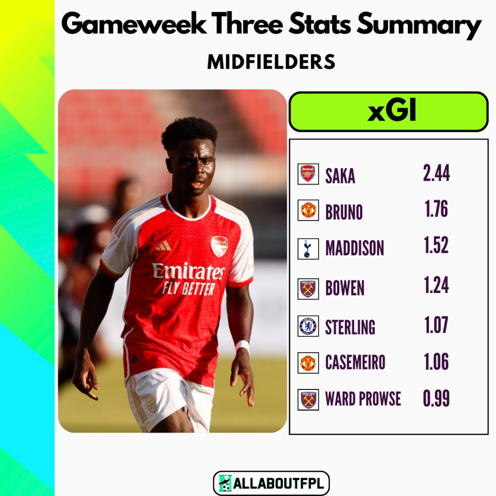 - Arsenal and Man United duo Saka and Bruno will play each other in GW4 but have excellent fixtures and are long-term holds, Bruno is 100% nailed on Pens and Saka too should take most of the penalties if not all. Bruno has the highest NPxGI amongst all players this season(3.1), he also has created the most big chances(4) in the PL, and himself had 3 big chances which shows his goal-scoring and assist potential.