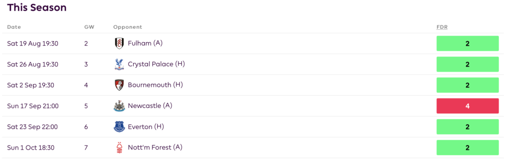 Nine of Villa’s next thirteen games have an FDR rating of 2. The next two are against teams who failed to score in GW1, they were two of only four teams who failed to find the back of the net last time. Therefore, Villa are likely to pick up clean sheets in these games.