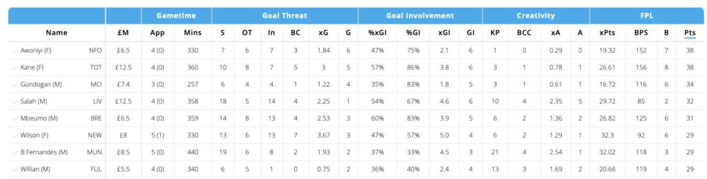Forest’s opposition- Sheffield United had the sixth worst xGC(2.07) last week. Furthermore, only Luton Town conceded more shots in the box than the Blades. Odsone Edouard (Sheffield United’s GW1 opponent’s striker) registered more shots in the box than anyone else last time out. Will Awoniyi feast at the expense of a shaky looking Blades’ defence ?