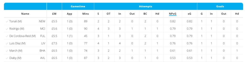 March ended GW1 with the highest NPxG(0.61) among the ยฃ6.5 midfielders. Only Joao Pedro had more shots in the box than him for Brighton. Last season for the Seagulls, March had more shots in the box (52) than any of his teammates.