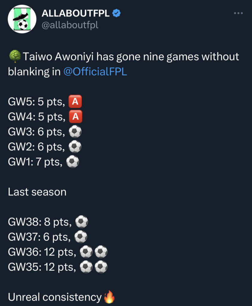 - A slightly differential 3-5-2 draft with Doku and Awoniyi in it. Awoniyi has silently been raking up points consistently this season and offers great value at his price point.