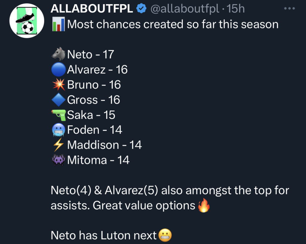 - A Trippier plus Salah draft which also has Neto as the enabler. Neto has four assists in the league already and he has also created the most chances(17) in the league so far. He’s up against Luton and is an excellent punt to consider on Wildcard.