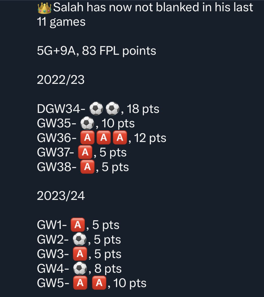 - Mo Salah has been silently raking up the points so far this season on a consistent basis, he’s one of the two players who has not blanked at all this season. Although he has registered only one double-digit haul this season, Liverpool have a great run of fixtures and King Mo could be back to his very best during the fixture run.