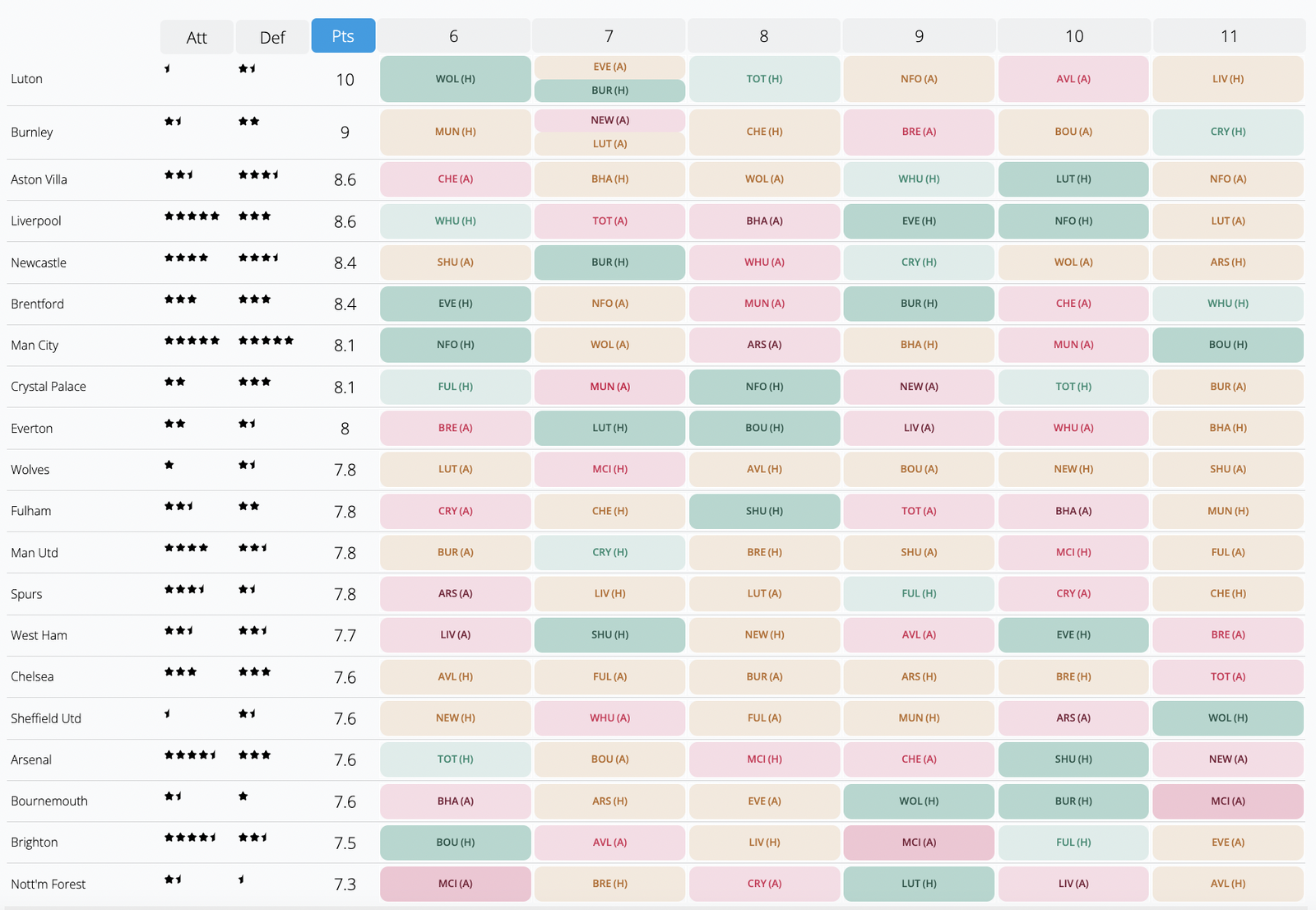 FPL Fixture Ticker from GW6-11