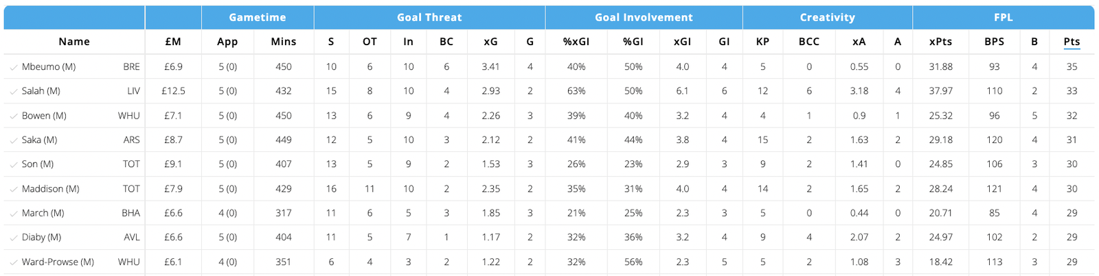 - Mbeumo has been a key player for Brentford this season and has already registered four goals in the opening five games of the season. His xG(4.14) and NPxG(2.56) is the highest amongst all midfielders this season, Brentford are also 4th amongst all teams for xG(10.53) and he’s another Wildcard essential this week.